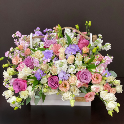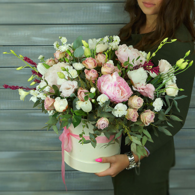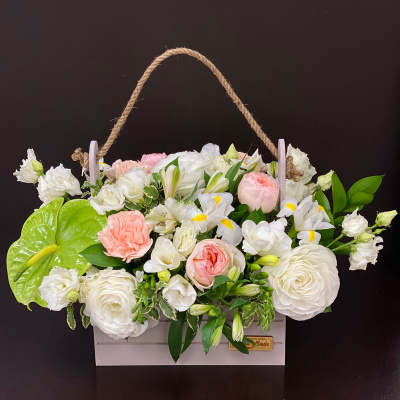 Флористы салона составляют композиции в ажурных плетеных корзинках и кашпо. В них продумано сочетание запахов, оттенков, выверена форма, плавность линий, уместно использованы зелень и сухоцветы. В каталоге есть: