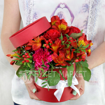 Композиция из роз, гиперикума и альстромерий в шляпной коробкеАртикул: B1693
