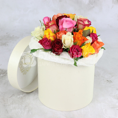 25 разноцветных роз в шляпной коробкеАртикул: K0245