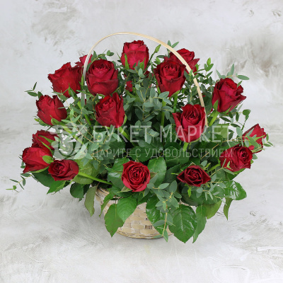 25 красных роз 40 см. с листьями фисташки в корзинеАртикул: B1658