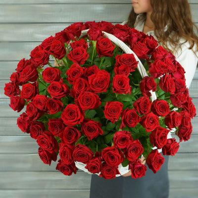 Букет из 101 красной розы в плетеной корзине (45 см)Артикул: R0056