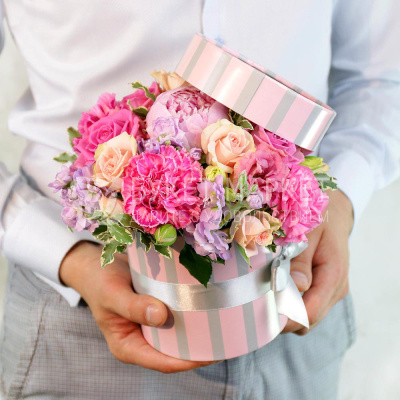 Композиция из роз, гвоздик и пиона в шляпной коробке 5 070 Р