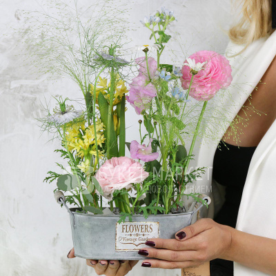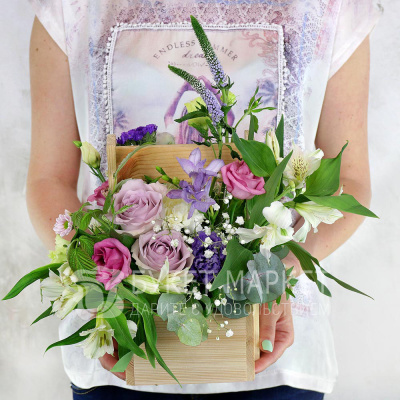 Композиция из лизиантусов, альстромерий и гипсофил в декоративном ящике 5 150 Р