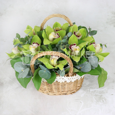 Корзина плетеная стандарт сред, Оазис кирпич, Орхидея Цимбидиум белая, Листья салал, Листья эвкалипт микс, Плёнка прозрачная
