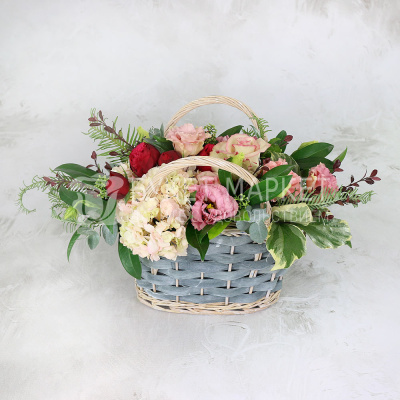 Корзина плетеная стандарт сред, Оазис кирпич, Роза Александра розовая, Роза Эквадор 60 см розовая, Лизиантус, Гортензия белая, Гвоздика оранжевая, Скимия кью грин, Листья амбрелла ферн (пучок), Листья хедера (пучок), Плёнка прозрачная