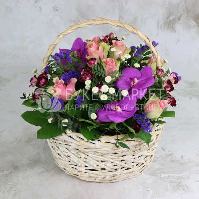 Корзина плетеная стандарт бол, Оазис кирпич, Роза 40 см розовая, Роза кустовая 40 см розовая, Статица, Ромашка (Танасетум), Орхидея Ванда фиолетовая, Листья фисташки, Листья салал, Плёнка прозрачная