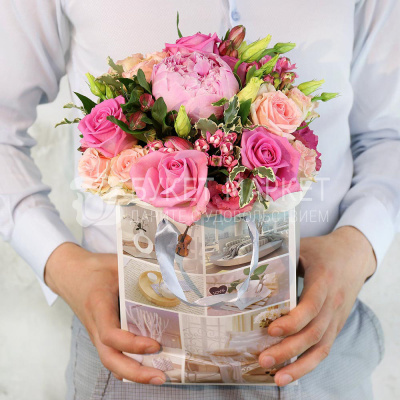 Композиция из роз, альстромерий и пиона в подарочной сумке 5 120 Р