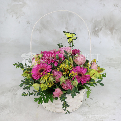Корзина плетеная стандарт мал, Оазис кирпич, Роза кустовая Клустер кремовая, Гербера мини белая, Альстромерия желтая, Гипсофила, Бабочка, Листья ледерварен (Папоротник), Листья эвкалипт микс, Плёнка прозрачная