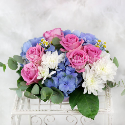 Композиция из ромашек, хризантем, гортензий и роз на подставке 4 450 Р