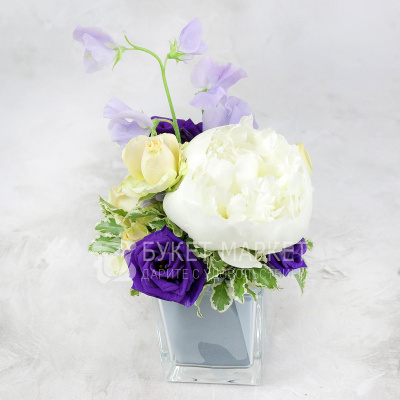 Пион коралловый, Гвоздика оранжевая, Гвоздика лунная фиолетовая, Лизиантус, Маттиола кремовая, Роза РС 40 см кремовая, Роза кустовая 60 см кремовая, Роза кустовая 40 см розовая, Листья питтоспорума микс, Коробка (D13H13), Горшок Лилия 120 мм, Оазис кирпич, Лента, Плёнка прозрачная