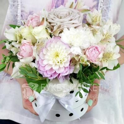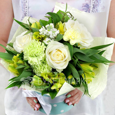 Композиция из альстромерий, роз и гвоздик в шляпной коробке 4 330 Р