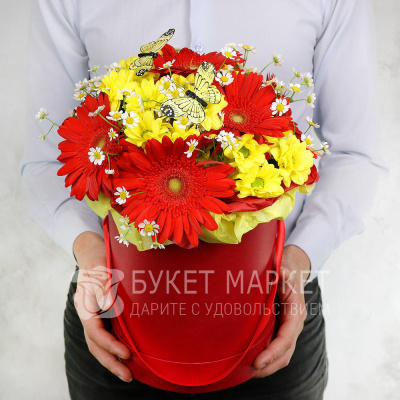 Коробка шляпная средняя, Комплект аквабокс, Хризантема кустовая желтая, Ромашка (Танасетум), Гербера малиновая, Бумага упаковочная Тишью, Бабочка, Лента, Плёнка прозрачная