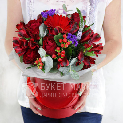 Композиция из роз, альстромерий и герберы в шляпной коробке 4 940 Р