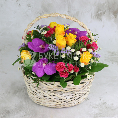 Корзина плетеная стандарт сред, Оазис кирпич, Роза 40 см розовая, Роза кустовая 40 см розовая, Статица, Ромашка (Танасетум), Орхидея Ванда фиолетовая, Листья фисташки, Листья салал, Плёнка прозрачная