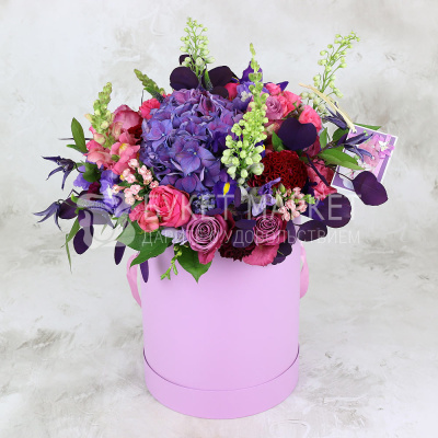 Композиция из ирисов, роз и гортензии в шляпной коробке 14 610 Р