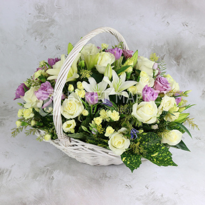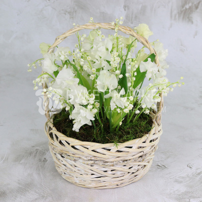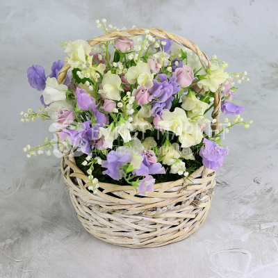 Корзина плетеная стандарт сред, Оазис кирпич, Латирус фиолетовый, Ландыш (Конваллария), Мох платмос, Плёнка прозрачная
