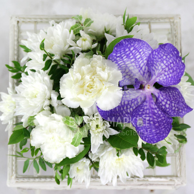 Хризантема кустовая желтая, Гвоздика оранжевая, Листья питтоспорума микс, Листья салал, Листья фисташки, Чаша Юниор, Оазис кирпич, Орхидея Ванда фиолетовая, Услуги флориста, Лента, Плёнка прозрачная