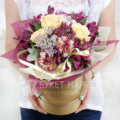Композиция из роз, альстромерий и маттиолы в шляпной коробке 4 490 Р