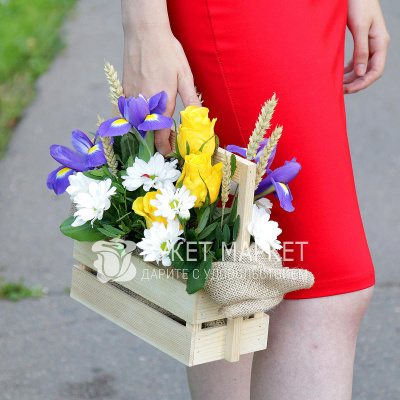 Корзина №6 дерево (25,5х11х23), Оазис кирпич, Упаковка в ассортименте, Ирис, Хризантема кустовая желтая, Роза 40 см розовая, Тритикум пшеница (Сушеный), Листья фисташки, Услуги флориста, Божья коровка, Лента, Плёнка прозрачная