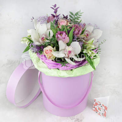 Композиция из орхидеи, тюльпанов и роз в шляпной коробке 7 540 Р