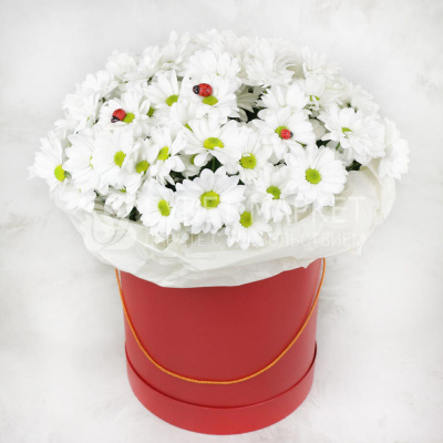 Хризантема кустовая желтая, Коробка шляпная большая, Комплект аквабокс, Бумага упаковочная Тишью, Божья коровка, Лента, Плёнка прозрачная