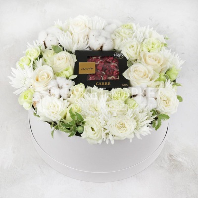 Роза Эквадор 60 см розовая, Роза кустовая 40 см розовая, Лизиантус, Гвоздика кустовая белая, Хризантема кустовая желтая, Роза 40 см розовая, Белый шоколад, 50G105, Хлопок, Коробка шляпная большая, Оазис кирпич, Лента, Плёнка прозрачная