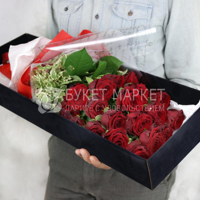 Композиция из 19 красных роз и питоспорума в бархатной коробке 6 490 Р