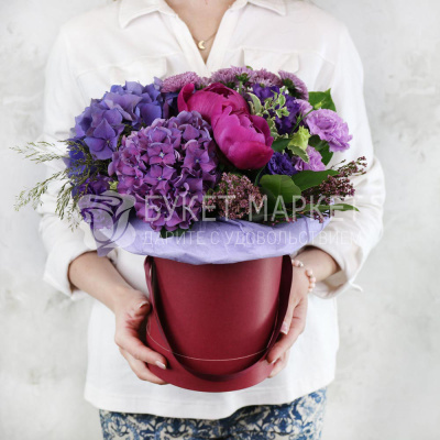 Композиция из пионов, гортензий, хризантем и лизиантусов в шляпной коробке 7 320 Р