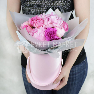 Композиция из розовых пионов и гвоздик в шляпной коробке 6 990 Р