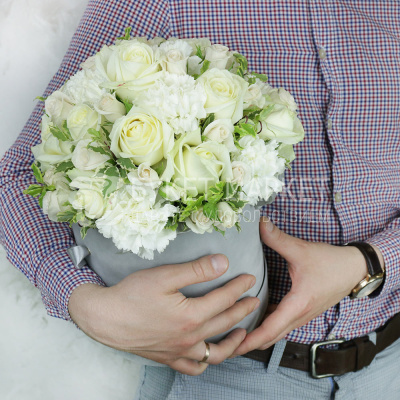 Композиция из белых роз и гвоздик в шляпной коробке 6 730 Р