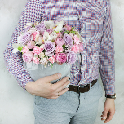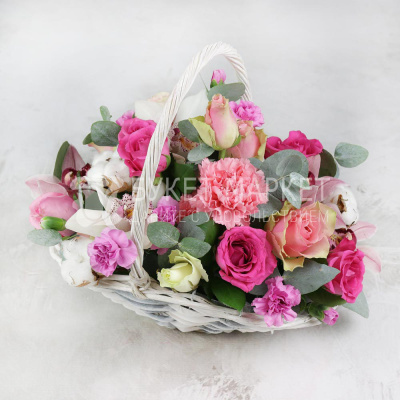 Композиция из орхидеи, гвоздики и роз в корзине 7 020 Р