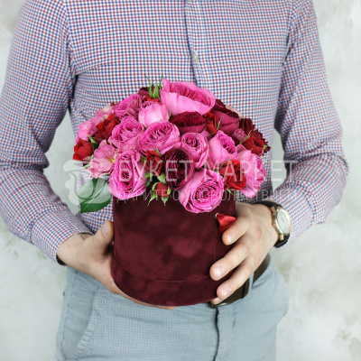 Композиция из красных и малиновых пионовидных роз в шляпной коробке 7 010 Р