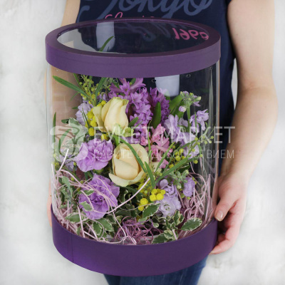 Гиацинт синий, Гвоздика лунная фиолетовая, Мимоза цветущая, Роза РС 50 см красная, Маттиола кремовая, Листья питтоспорума микс, Коробка шляпная большая, Подставка для цвет. горшка 160мм (8), Наполнитель бумажный, Оазис кирпич, Лента, Плёнка прозрачная