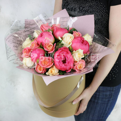 Композиция из розовых пионов и роз в шляпной коробке 8 460 Р