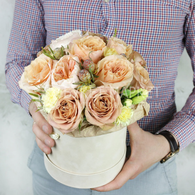 Композиция из пионовидных роз в шляпной коробке 6 100 Р