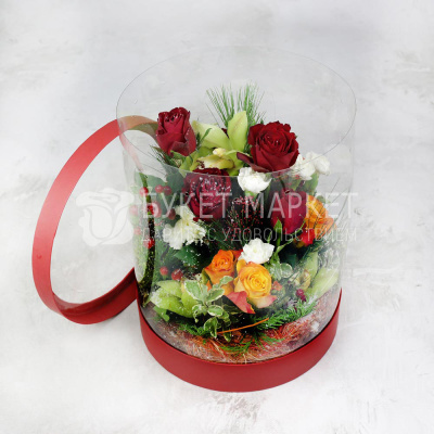 Композиция из орхидеи, роз и хвои в шляпной коробке 8 770 Р