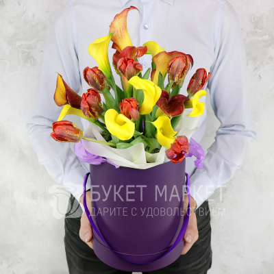 Композиция из калл и тюльпанов в шляпной коробке 8 960 Р