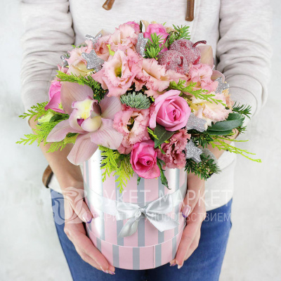 Новогодняя композиция из лизиантусов, роз и орхидей в шляпной коробке 6 370 Р
