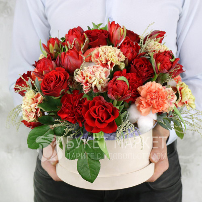 Композиция Козерогу из роз, гвоздик и тюльпанов в бархатной коробке 8 890 Р