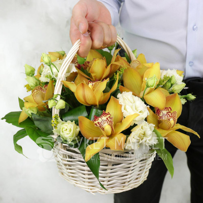 Корзина плетеная стандарт сред, Оазис кирпич, Лизиантус, Орхидея Цимбидиум белая, Листья салал, Солидаго микс, Листья аспидистра, Лента, Плёнка прозрачная