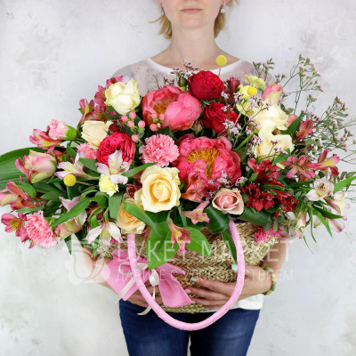 Композиция из альстромерий, роз, пионов и гвоздик в декоративной сумке 12 250 Р