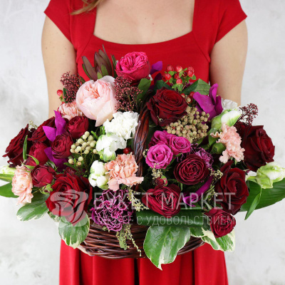 Корзина плетеная стандарт сред, Оазис кирпич, Гиперикум красный, Капс, Роза Александра розовая, Роза Александра розовая, Тюльпан ВС желтый, Листья аспидистра, Листья хедера (пучок), Роза кустовая Клустер кремовая, Гвоздика оранжевая, Гвоздика оранжевая, Гвоздика оранжевая, Роза кустовая 50 см оранжевая, Роза РС 50 см красная, Скимия рубелла, Мимоза цветущая, Леукадендрон микс, Листья эвкалипт с яг/цв/краш, Лента, Плёнка прозрачная