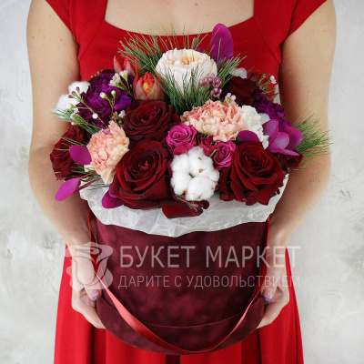Роза Александра розовая, Листья эвкалипт с яг/цв/краш, Сосна стробус, Роза РС 50 см красная, Хлопок, Хамелациум, Роза кустовая 50 см оранжевая, Гвоздика лунная фиолетовая, Гвоздика оранжевая, Тюльпан ВС желтый, Коробка БАРХАТ (20х20хH17), Бумага упаковочная Тишью, Лента, Плёнка прозрачная