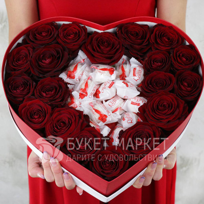 Композиция из красных роз и конфет Раффаэлло в сердце 6 290 Р