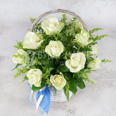 Композиция из 15 белых роз с солидаго в корзине 4 010 Р