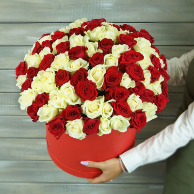 Букет из 101 красной и белой розы в шляпной коробке 18 560 Р