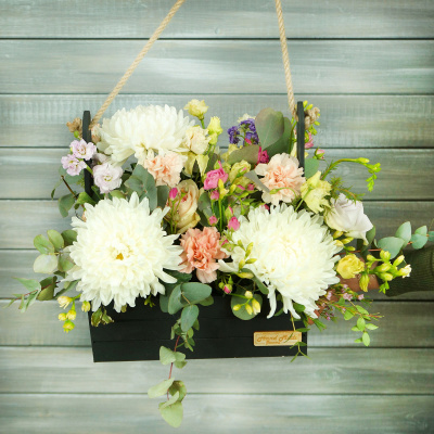 Композиция котик из хризантем и роз в сердце 3 440 Р