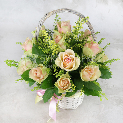 Роза Лабелла - 15 шт; Солидаго микс - 3 шт; Корзина плетеная стандарт мини - 1 шт; Оазис кирпич - 0,3 шт; Листья салал - 0,2 шт; Плёнка прозрачная - 1 шт.