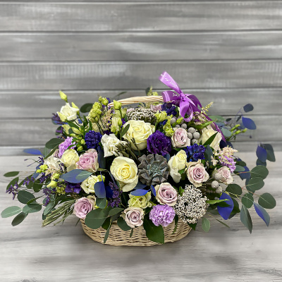 Корзина плетеная стандарт бол, Плёнка прозрачная, Оазис кирпич, Роза Эквадор 60 см розовая, Роза Александра розовая, Гиацинт синий, Гиацинт синий, Агапантус микс, Кларкия, Эхеверия, Листья эвкалипт с яг/цв/краш, Ромашка (Танасетум), Озатамнус, Фрезия белая, Астильба розовая, Лента с логотипом (ББ)