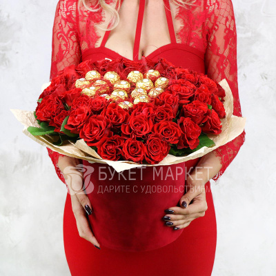 Букет из красных роз с конфетами в шляпной коробке 6 960 Р